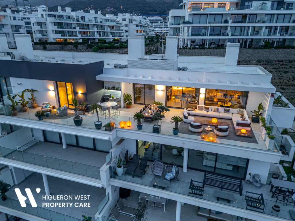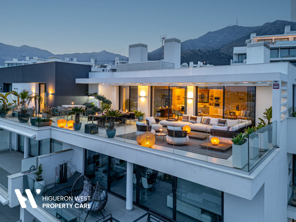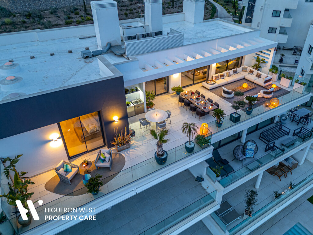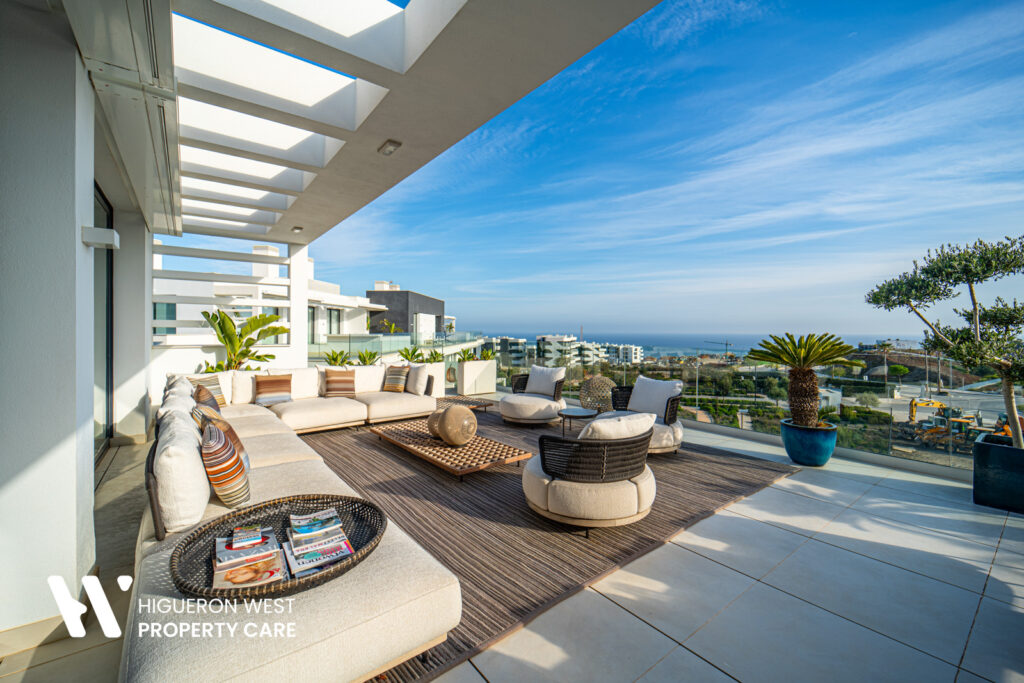 This is without a doubt the most beautiful, sought-after Sky Villa in Higueron West. Located in Phase 2 of the Higueron West project, this penthouse has a massive sea view towards the southwest. With nothing blocking the views, you can see the Harbor of Fuengirola, the gardens below, and a full sea view towards the South. Depending on the time of the year, you will even get a glimpse of the mountains of Africa! The views are simply exceptional!